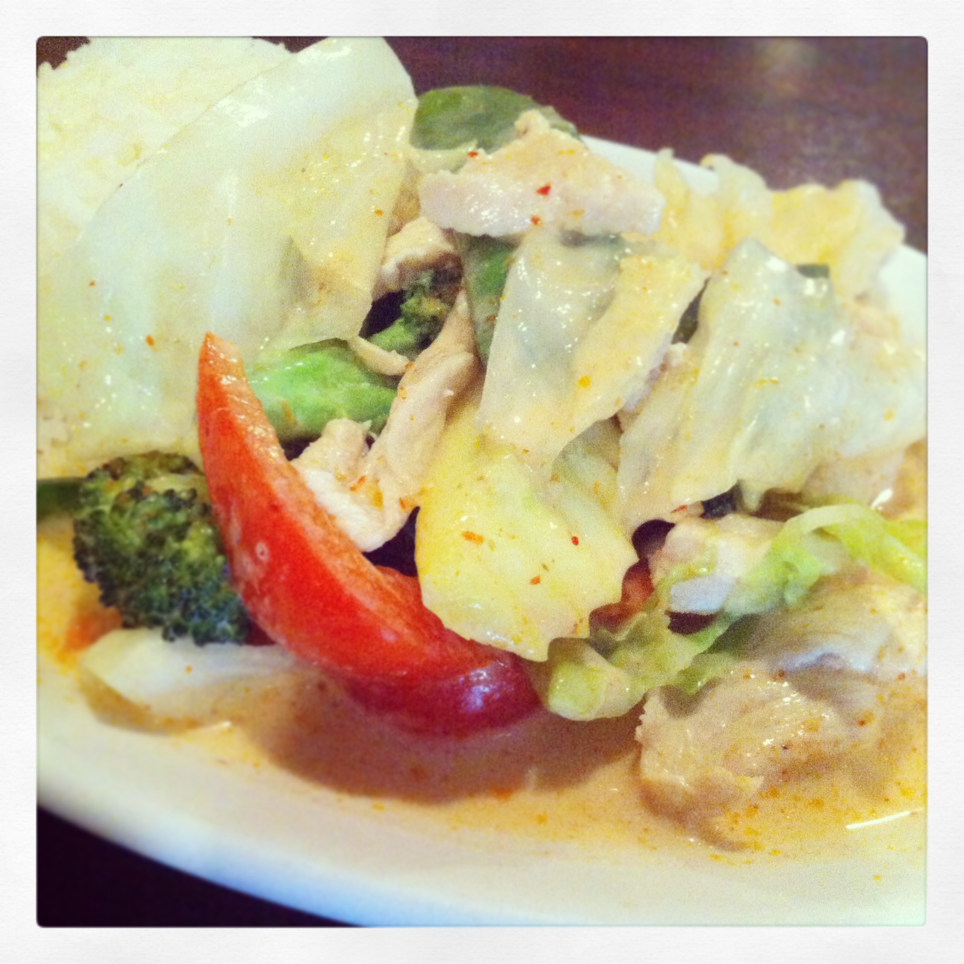 Next we had the Red Curry with Chicken which is served with steamed white rice. It has a blend of vegetables and a nice creamy texture. You can choose your level of heat, though I always go “1 star.” They have a variety of curries available – red, green (it gets its color from the coconut milk base mixed with Thai basil and green chillies), Panang (generally a milder curry), Choo Chee (usually a thicker curry, similar to red) – with your choice of mixed vegetables, tofu, chicken, pork, beef, shrimp or squid. They don’t have massaman curry which is my favorite, but I like the red curry quite a bit.