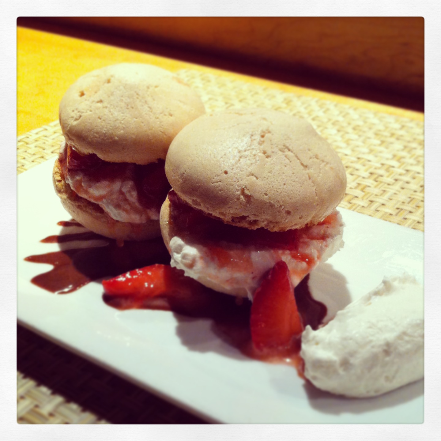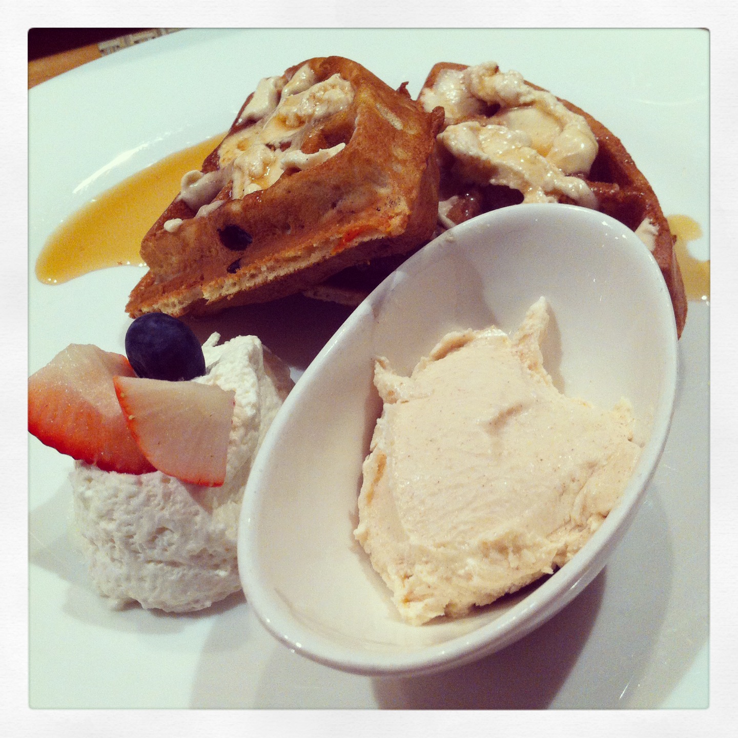 For dessert we may have gone a little overboard. We ordered the Strawberry Macaroons from the Special Menu. I love food that tastes good just looking at it. The macaroons were crisp with a chewy inside and filled with fresh whipped cream and strawberries. This is totally my type of dessert – sweet and light. On the other end of the spectrum, we ordered the Carrot Cake Inspired Waffles. These things are no joke. Basically a Belgian Waffle that tastes just like Carrot Cake, covered with a cream cheese spread and syrup served with vanilla ice cream. It was warm, rich, decadent and felt like epitome of comfort food.