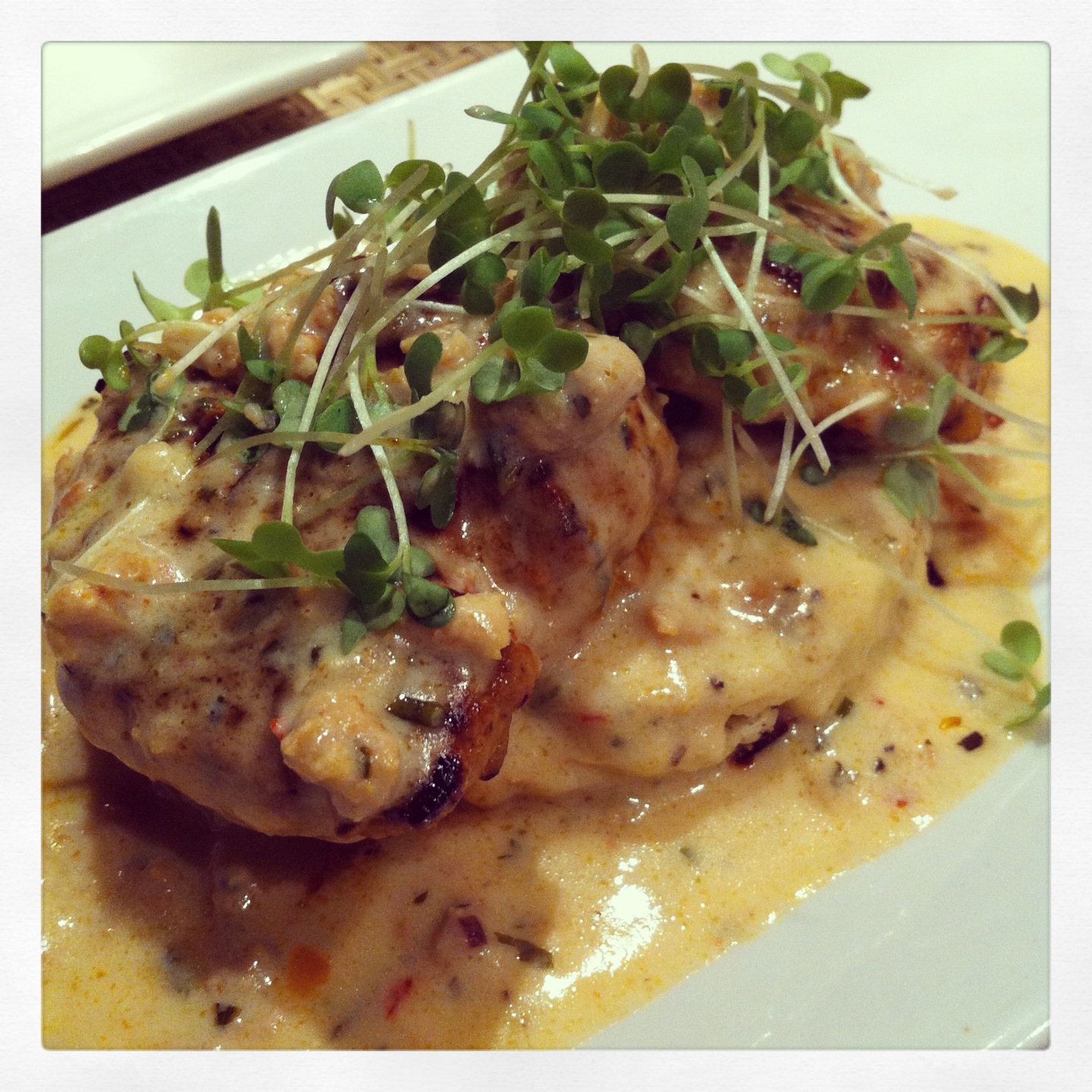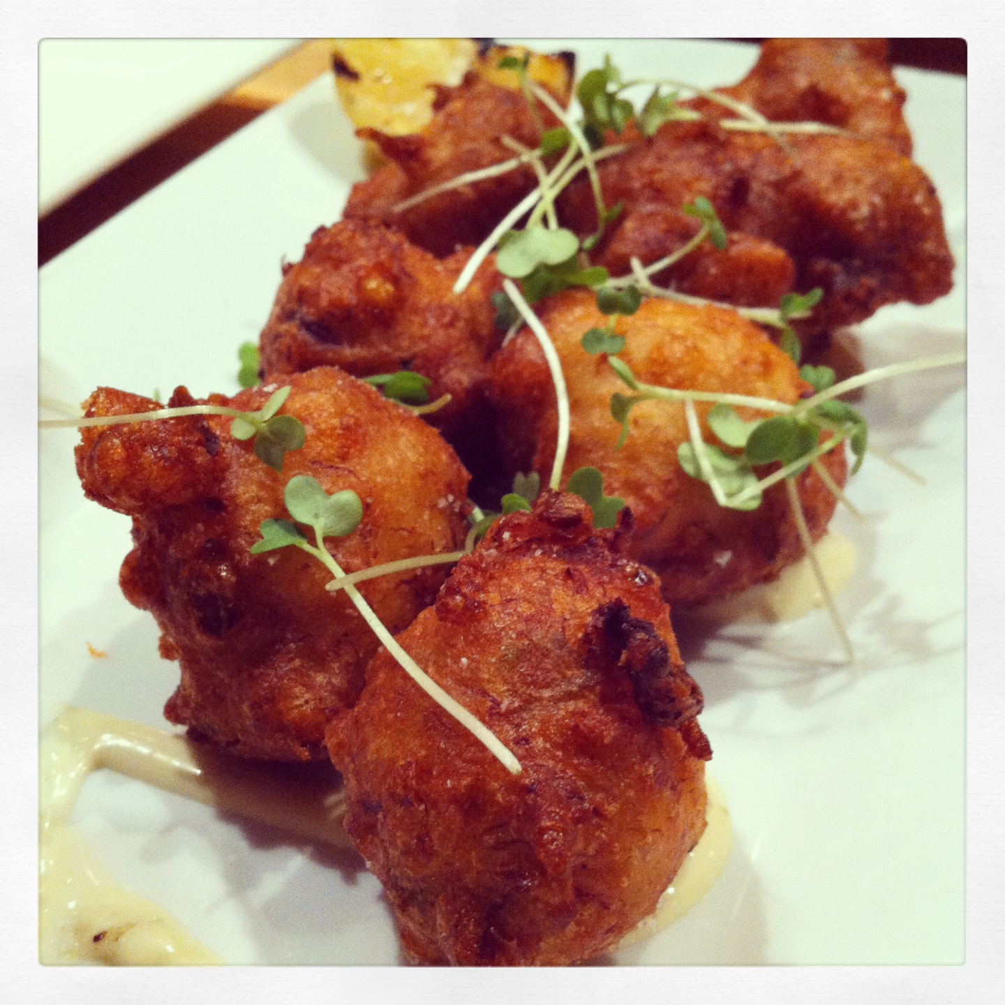We popped into Coolinary the other night for dinner and took a seat at the bar. There is a daily specials menu, so make sure to check it out. It was fairly early, so we decided to go with a few smaller plates. We started out with the Deviled Eggs, which are almost too pretty to share their name with what you typically find at a barbecue or Super Bowl party. They were perched in a perfect line down the plate with whipped filling both anchoring them and creating a peak in each egg white shell – so yummy. Next, we tried the Crab and Corn Beignets which were perfectly fried and served with a horseradish aioli and a grilled lemon to squeeze. The texture was great as was the flavor. And who doesn’t love a fritter? Then we took on the Chicken and Gravy Biscuits which were delightful. The biscuits were fluffy, the chicken was crisp and the gravy had a creamy consistency without being too heavy. I  loved their use of micro greens to bring a pop of color to any dish. There is definitely a flair for presentation.