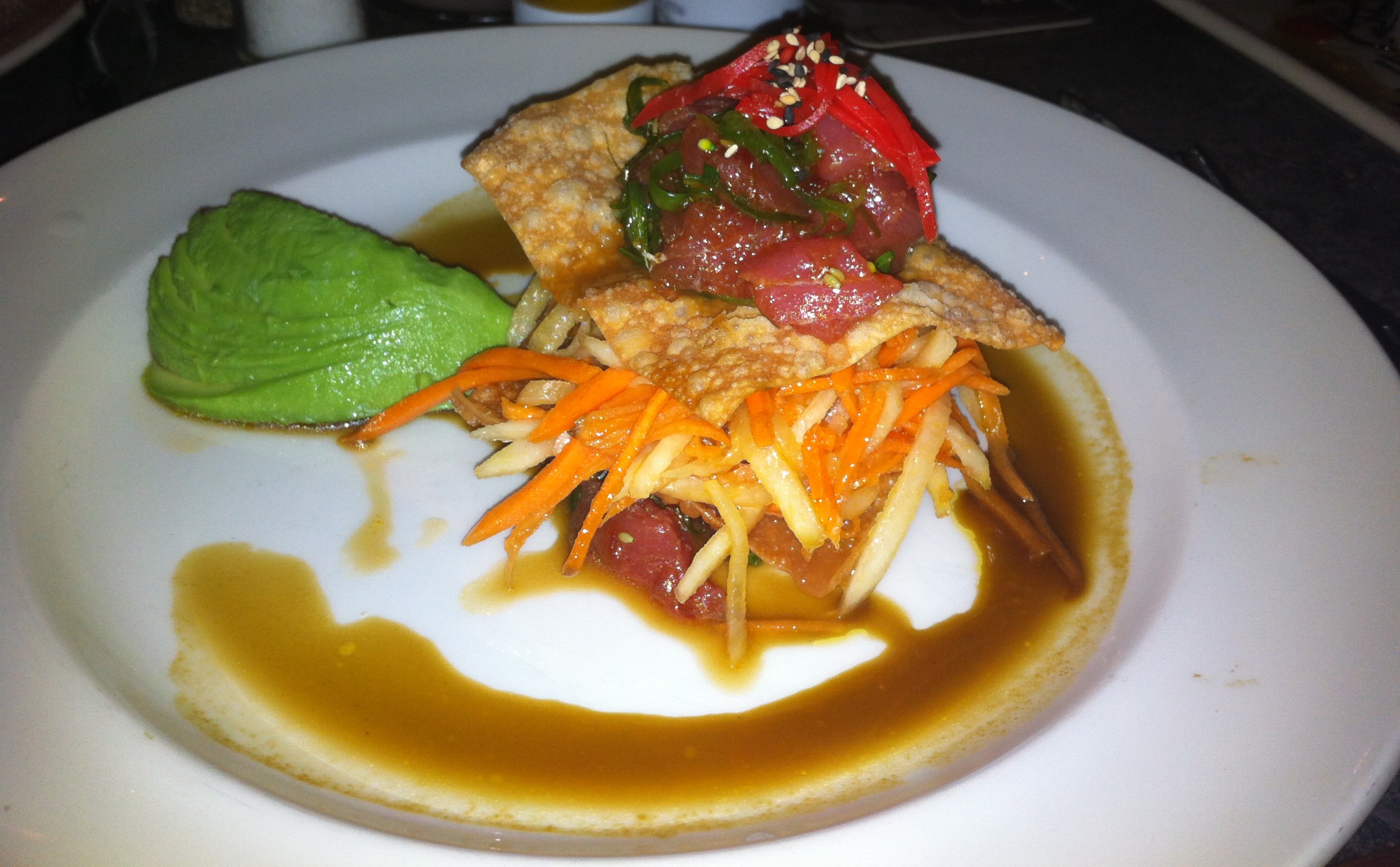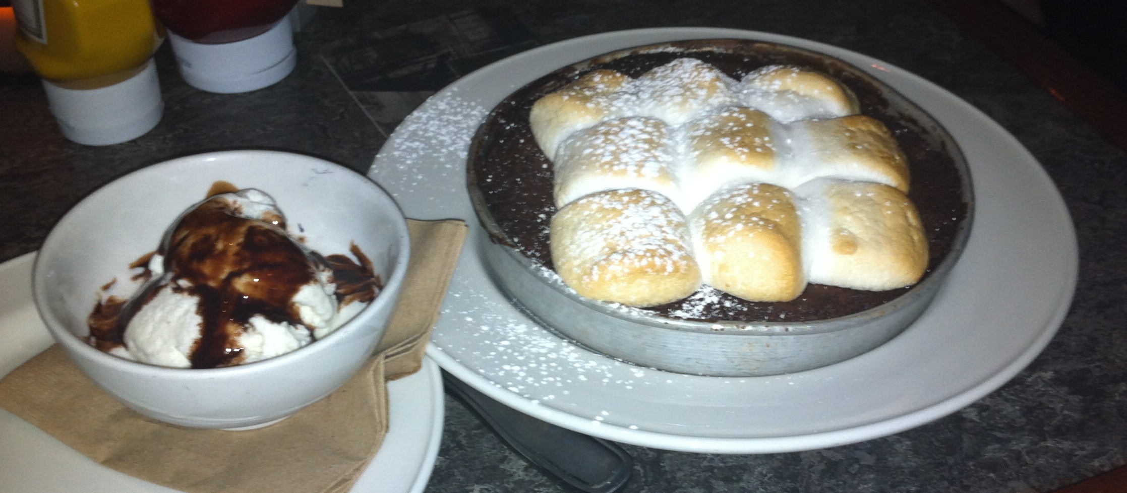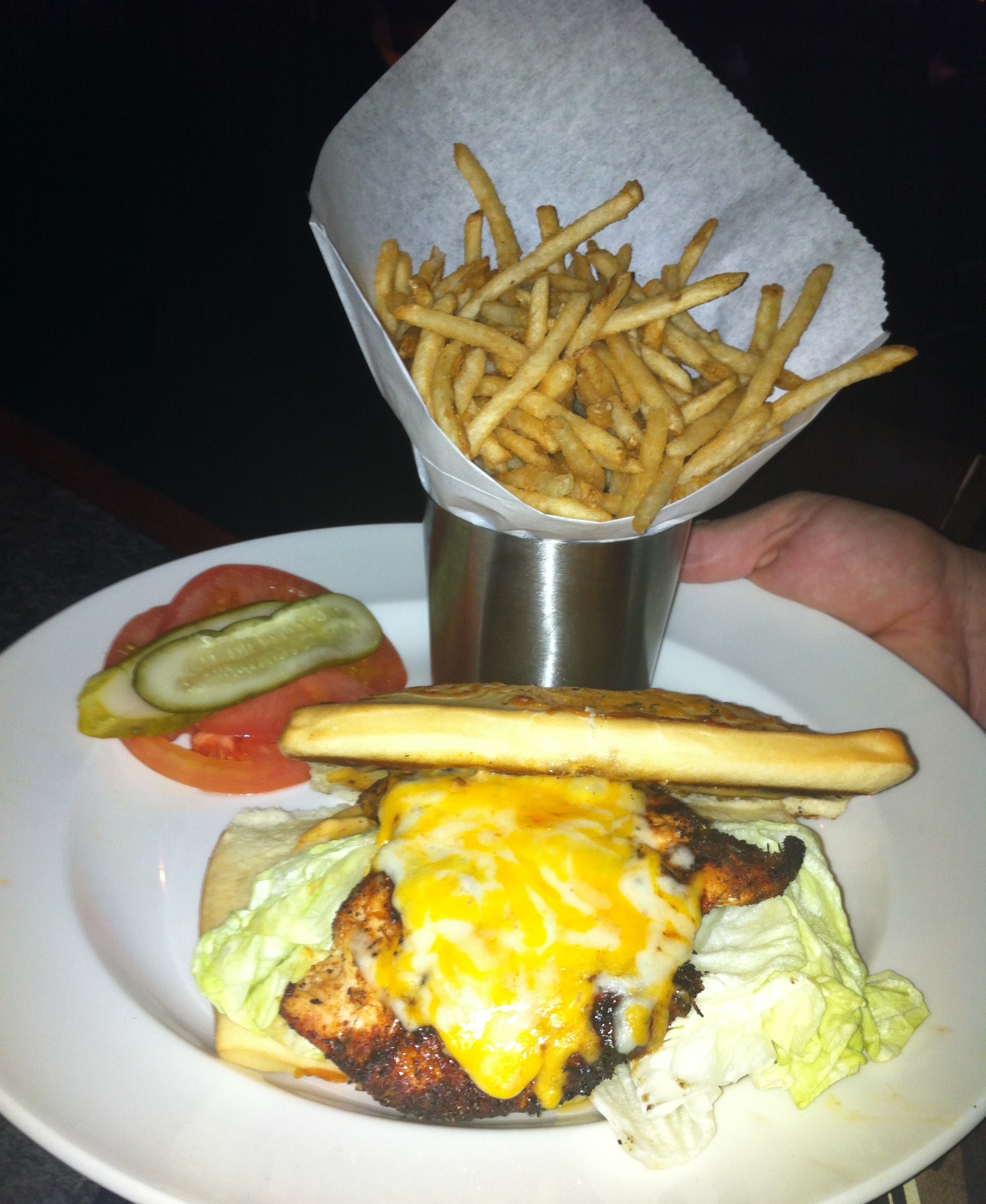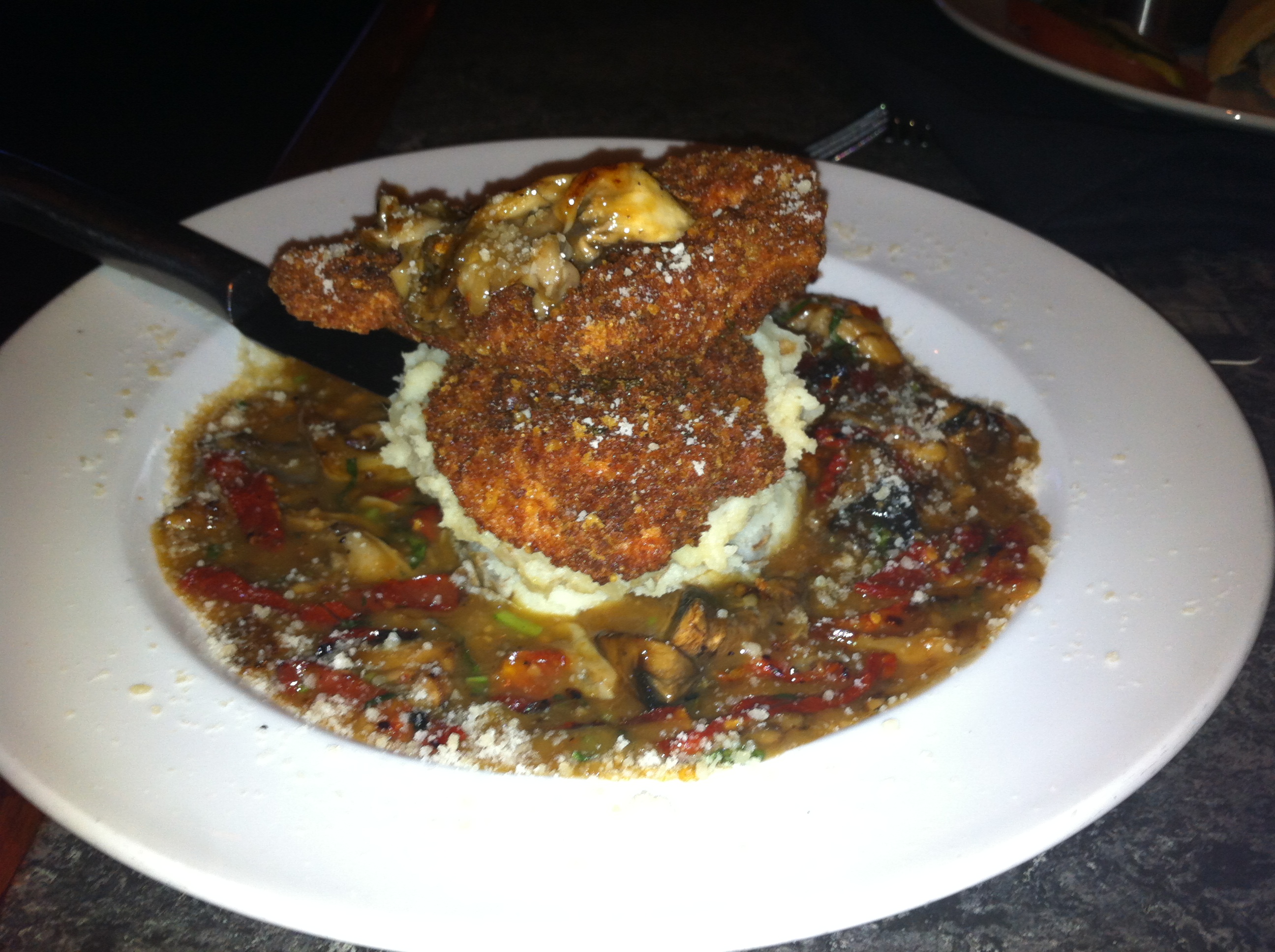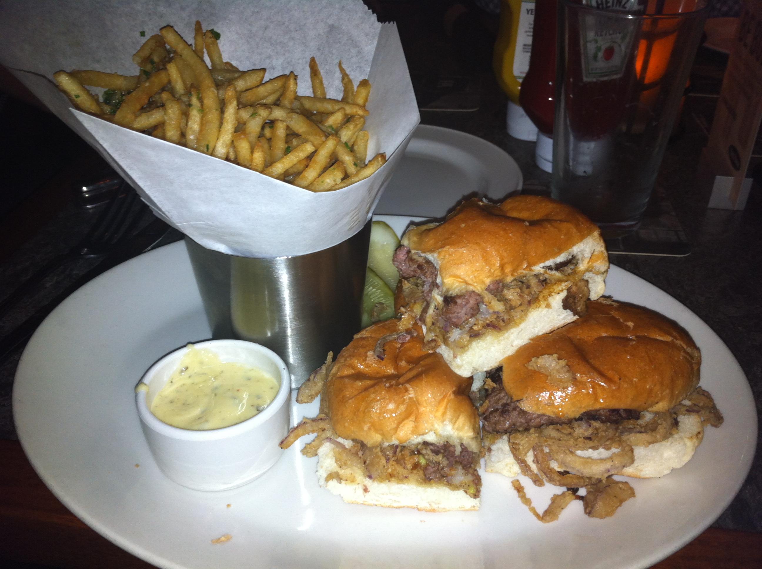 We started with the Bearnaise Sliders, which are my favorite. Four mini burgers topped with fried onions and pickles, they are served with a side of béarnaise sauce and fries – yum. I went with the California Roll, which is an interesting take on the classic sushi roll. It is not a roll actually, but instead a sushi rice cake with snow crab meat and cucumber, topped with avocado and tobiko and served with soy sauce. Lindsay had the Ahi Poke Bowl of marinated ahi tuna with avocado, carrots, radish, macadamia nuts and crispy wontons. Andrew had his usual Spicy Chicken Breast Sandwich which he always requests with lettuce instead of cabbage and no cheddar only jack cheese. It comes on a flatbread with cajun coli and a side of fries. Zach had the Parmesan Crusted Chicken served with garlic mashed potatoes, sun-dried tomato and three mushroom sauce.