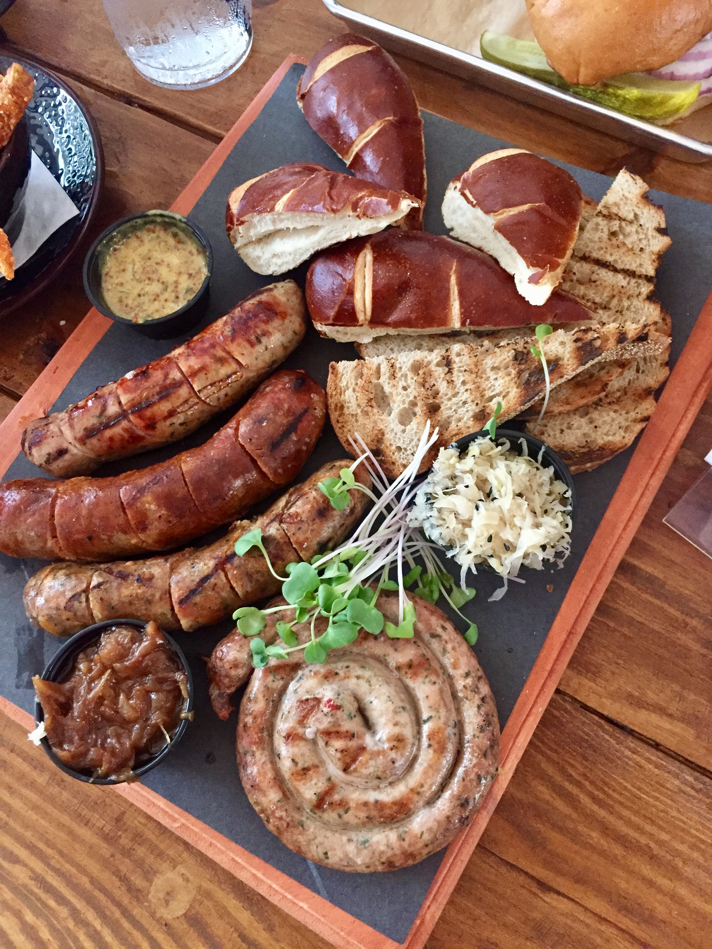 For an entree we shared the Assorted Sausage Platter with German-Style Beer Bratwurst, Chorizo, Jalapeño Cheddar Pork Sausage and Lamb and Feta Sausage served with toasted ciabatta and pretzel buns. I went Beer Brat on a Pretzel Bun and that was a good decision. We accompanied them with the Kaese Spaetzle, which is an egg pasta with cheese and bacon similar to Mac and Cheese, and the Brussel Sprouts, which are served sautéed then flash fried with a brown sugar and sea salt coating. The Sweet Potato Fries were hand-cut with a honey dill mayo dipping sauce.