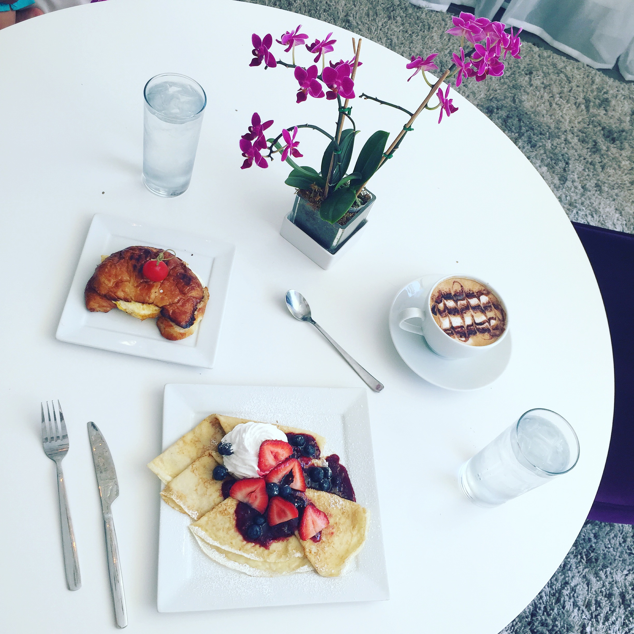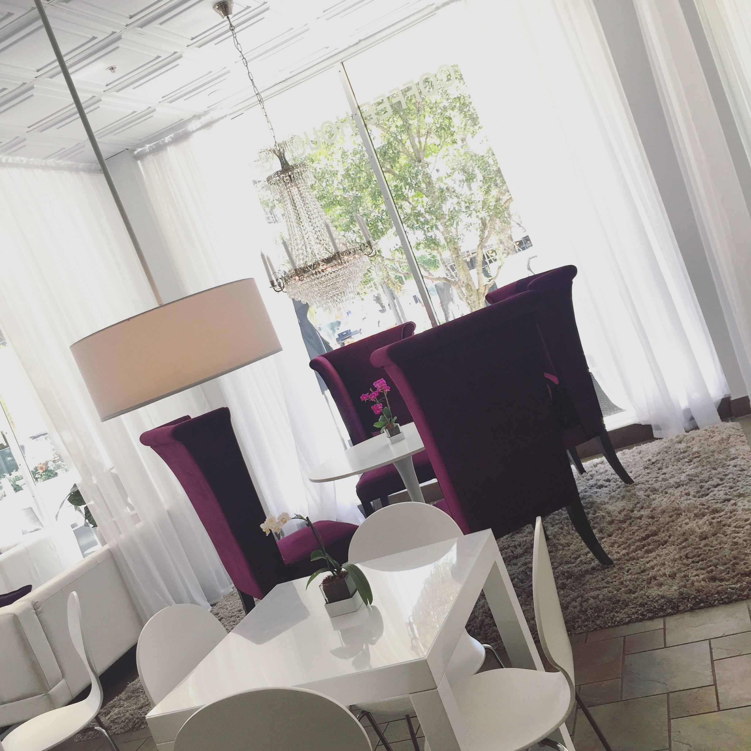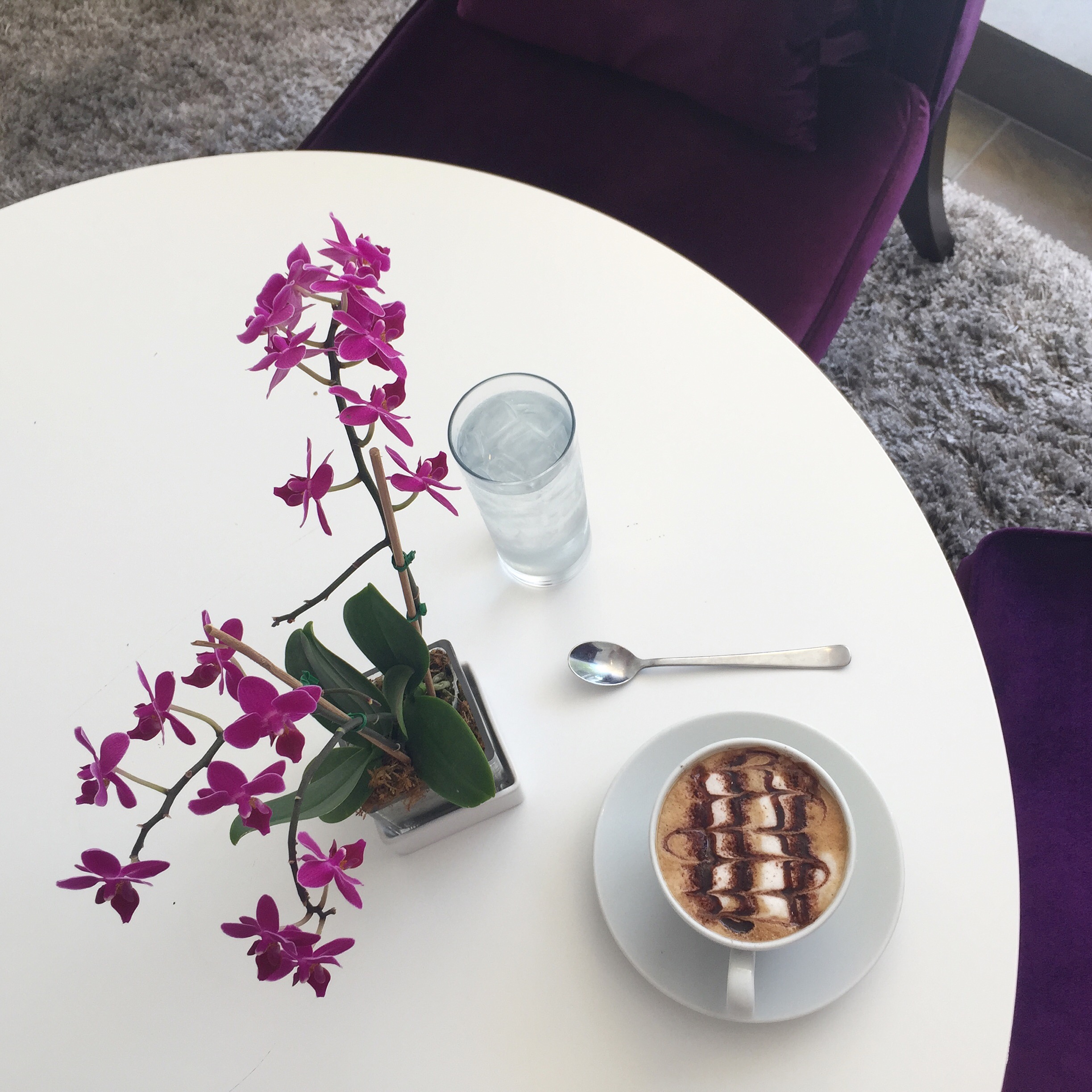 We ordered at the front counter then made our way to a white round table with large purple wingback chairs and fresh orchids under a sparkling chandelier. This is now the only way I know how to enjoy a cup of coffee.
