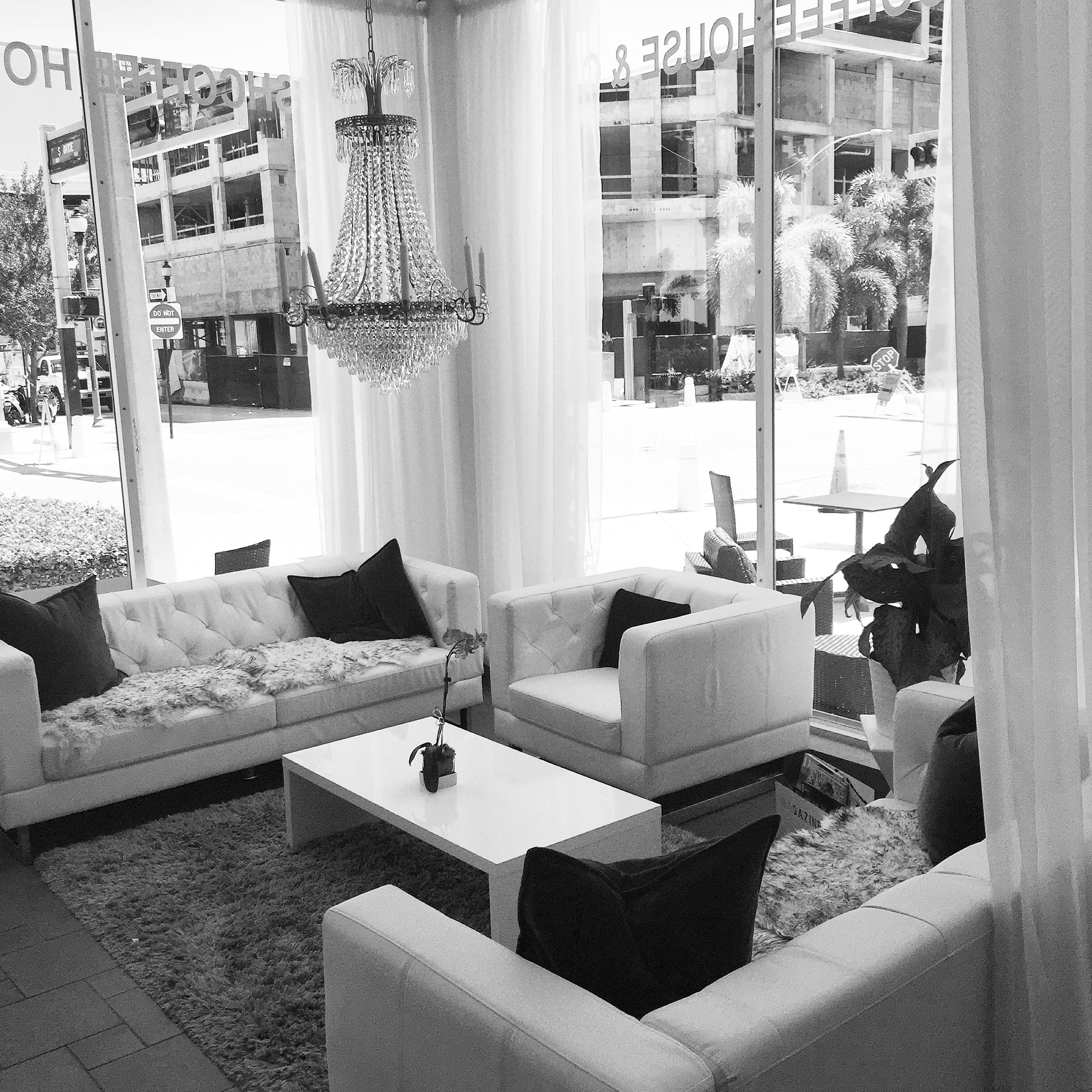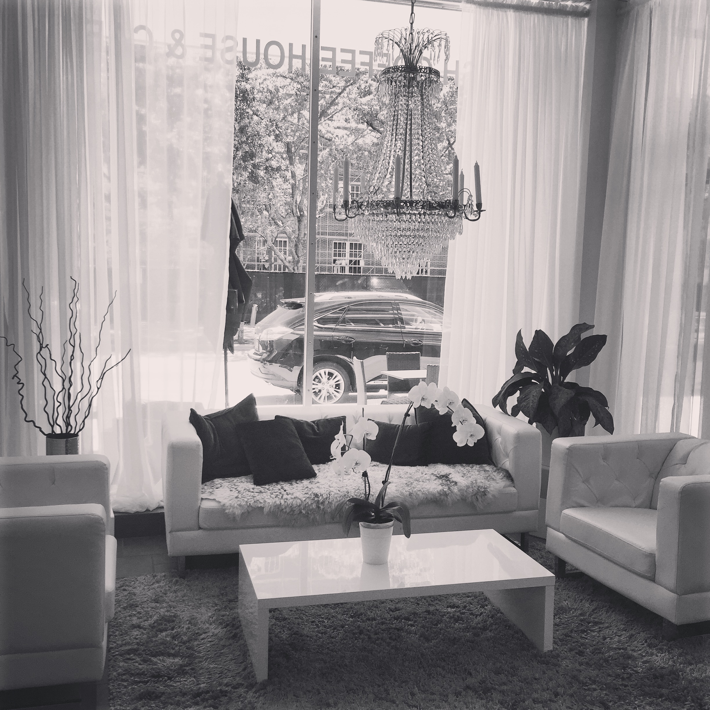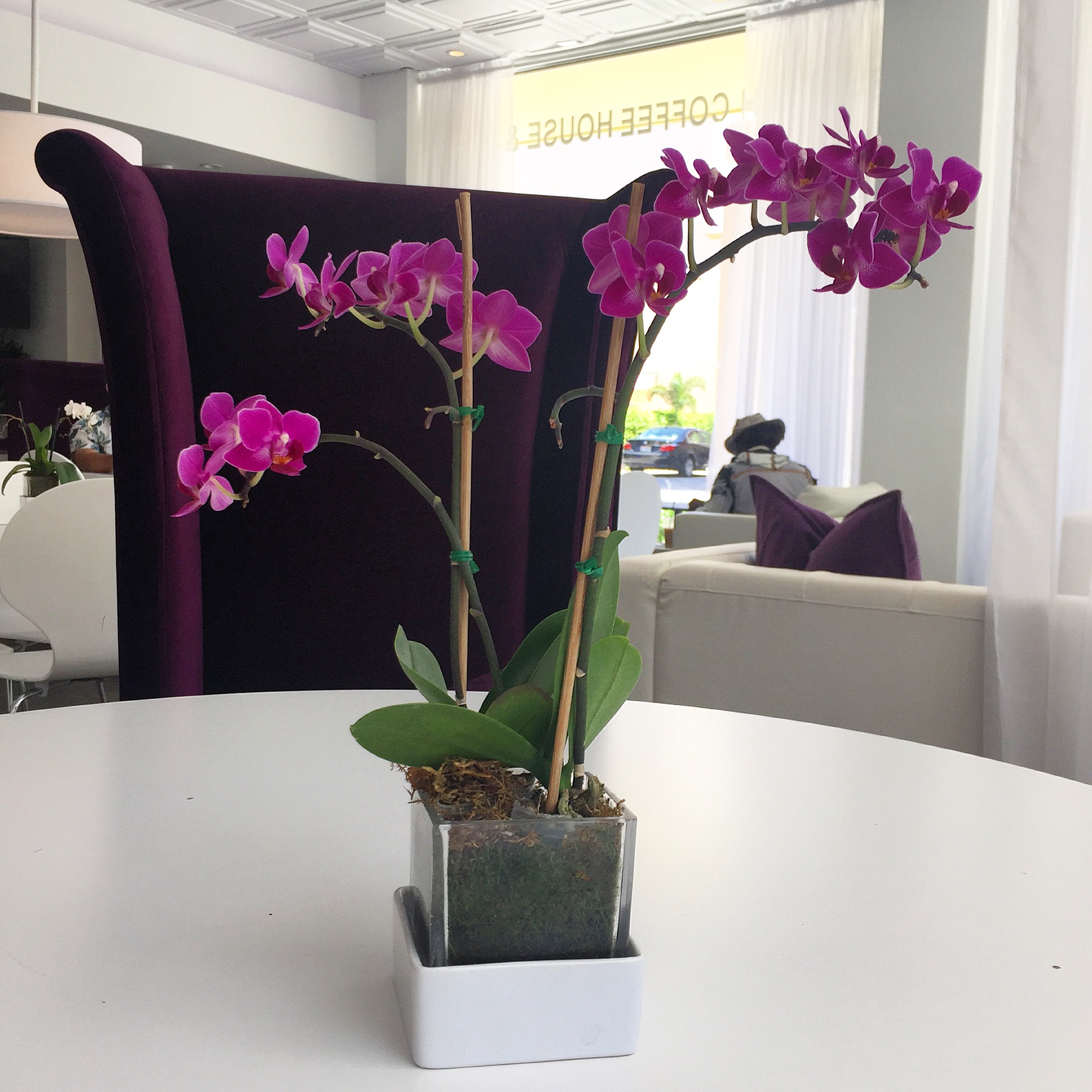 We ordered at the front counter then made our way to a white round table with large purple wingback chairs and fresh orchids under a sparkling chandelier. This is now the only way I know how to enjoy a cup of coffee.