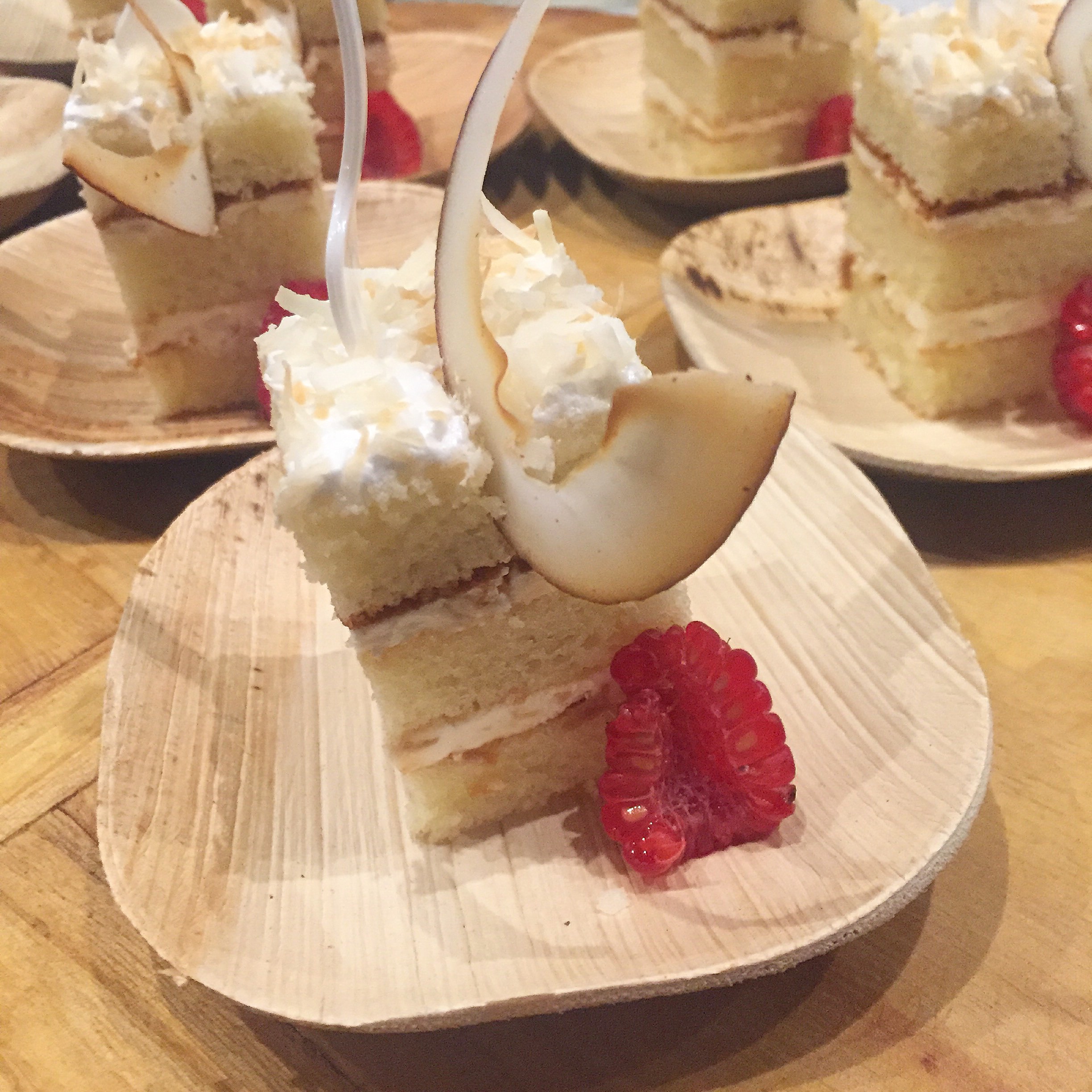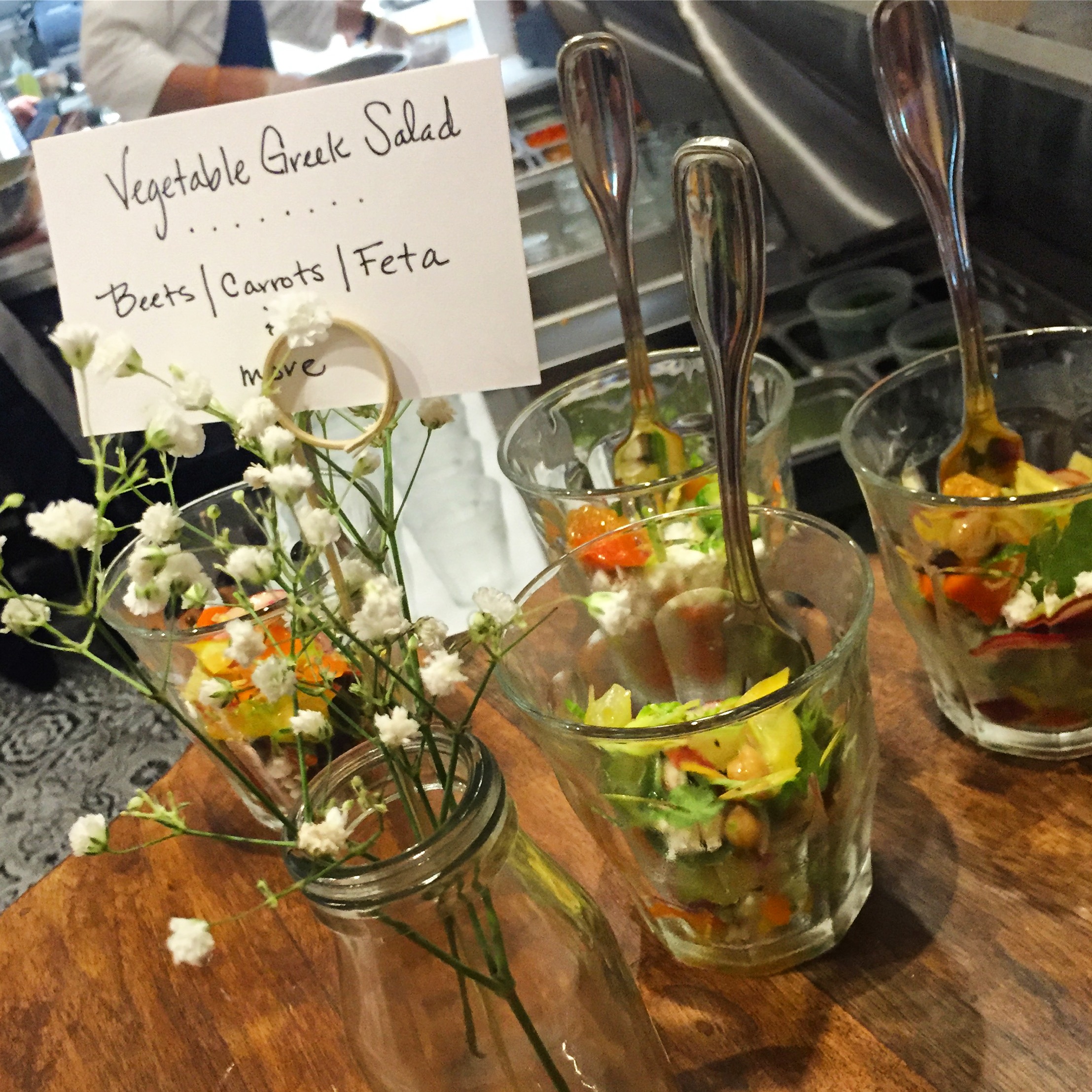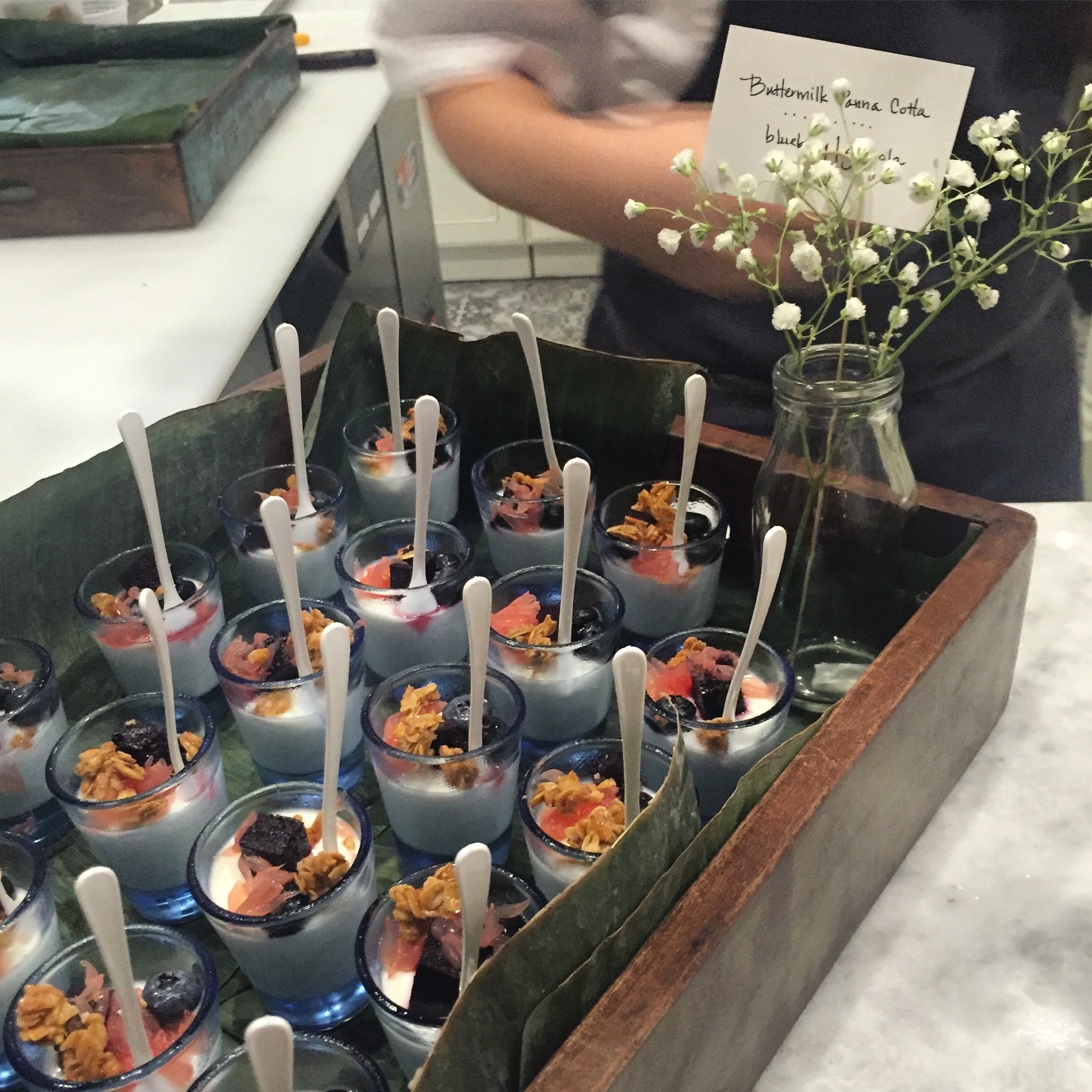 As the food began to make the rounds on thick wooden trays and boards I was excited to see the bites were what I had imagined – an elevated take on Southern cuisine – with some surprises here and there stemming from Autry’s resume. We started off with Classic Pimento Cheese served on crackers and with raw veggies. The parsley and dill gave a freshness to the roasted piquillos. Next up was a Vegetable Greek Salad which was light but earthy with hunks of creamy feta piled in with dressed beets and carrots. The Tomato Pie was the big surprise for me. I expected a plain tomato flatbread but instead got hit with the flavorful herb aioli and immediately felt an overwhelming urge to ask for the recipe. The Brussel Sprouts won my husband’s “best dish” vote of the night which was almost impossible to accept as getting him to eat brussels is a challenge I thought I had begun to give up on. The rounds continued with Vegetable Gnocchi and Pickled Shrimp and then the finale of desserts which made me wish I hadn’t taken seconds of every other dish. Buttermilk Panna Cotta with fresh berries and granola started off the line followed by Betty’s Coconut Cake and then the star of the show, Dark Chocolate and Sea Salt Cookies. I feel compelled to apologize for the number of cookies my husband and I consumed, but in all honesty I would do it again. They were light but decadent, sweet but salty, and just generally delicious. I also ate the coconut cake with reckless abandon but it felt less guilty as I limited myself to one piece.
